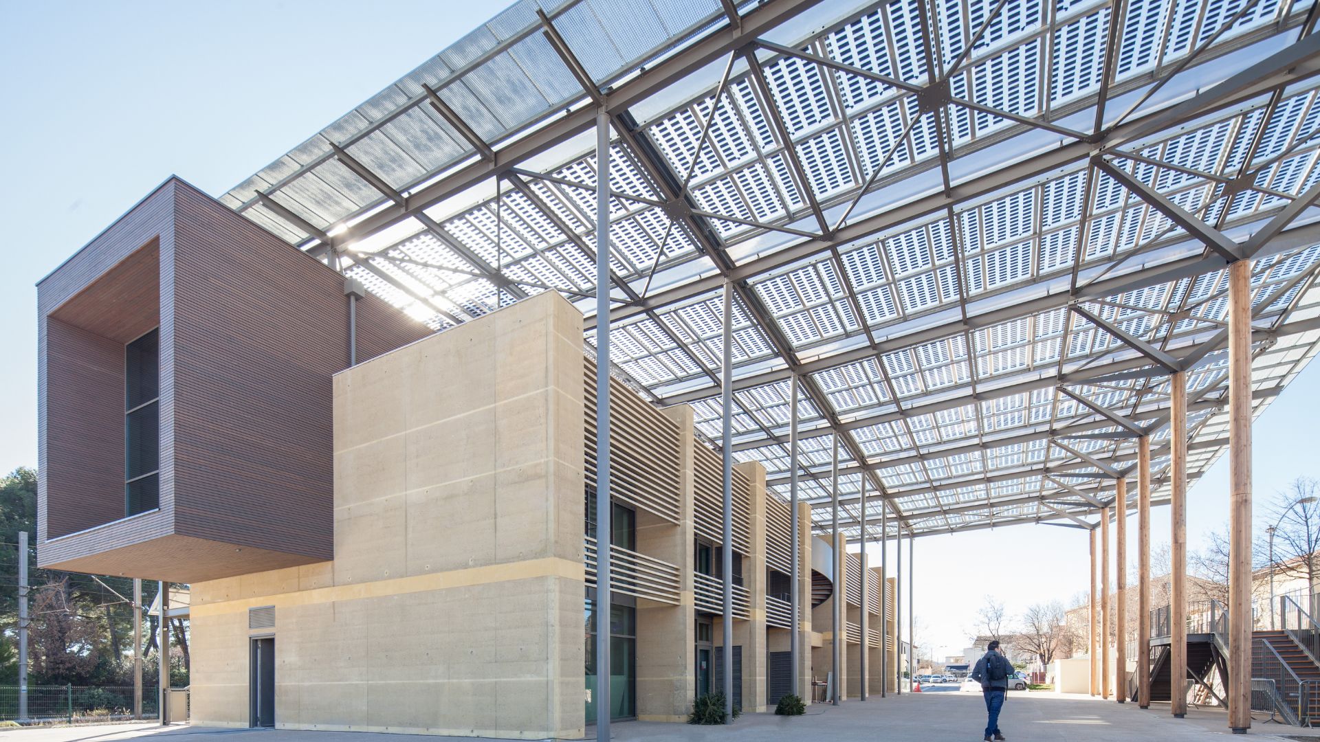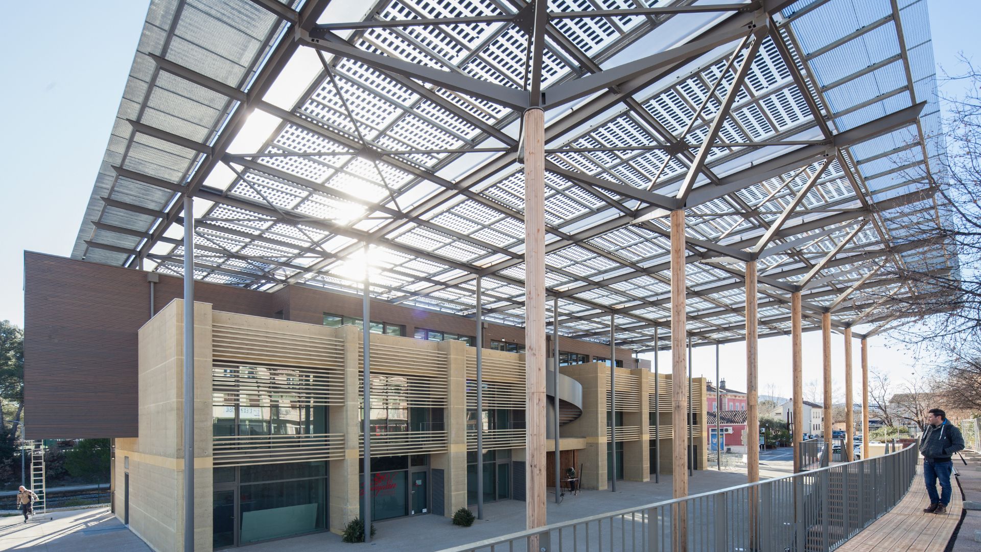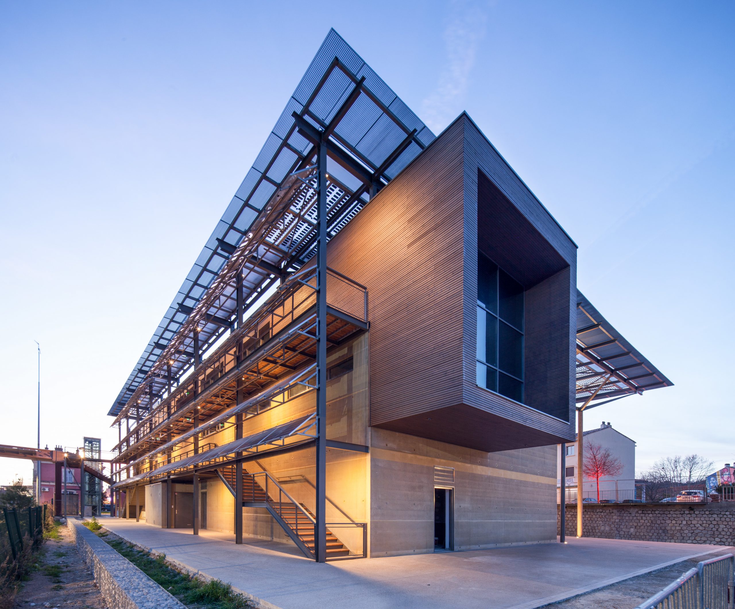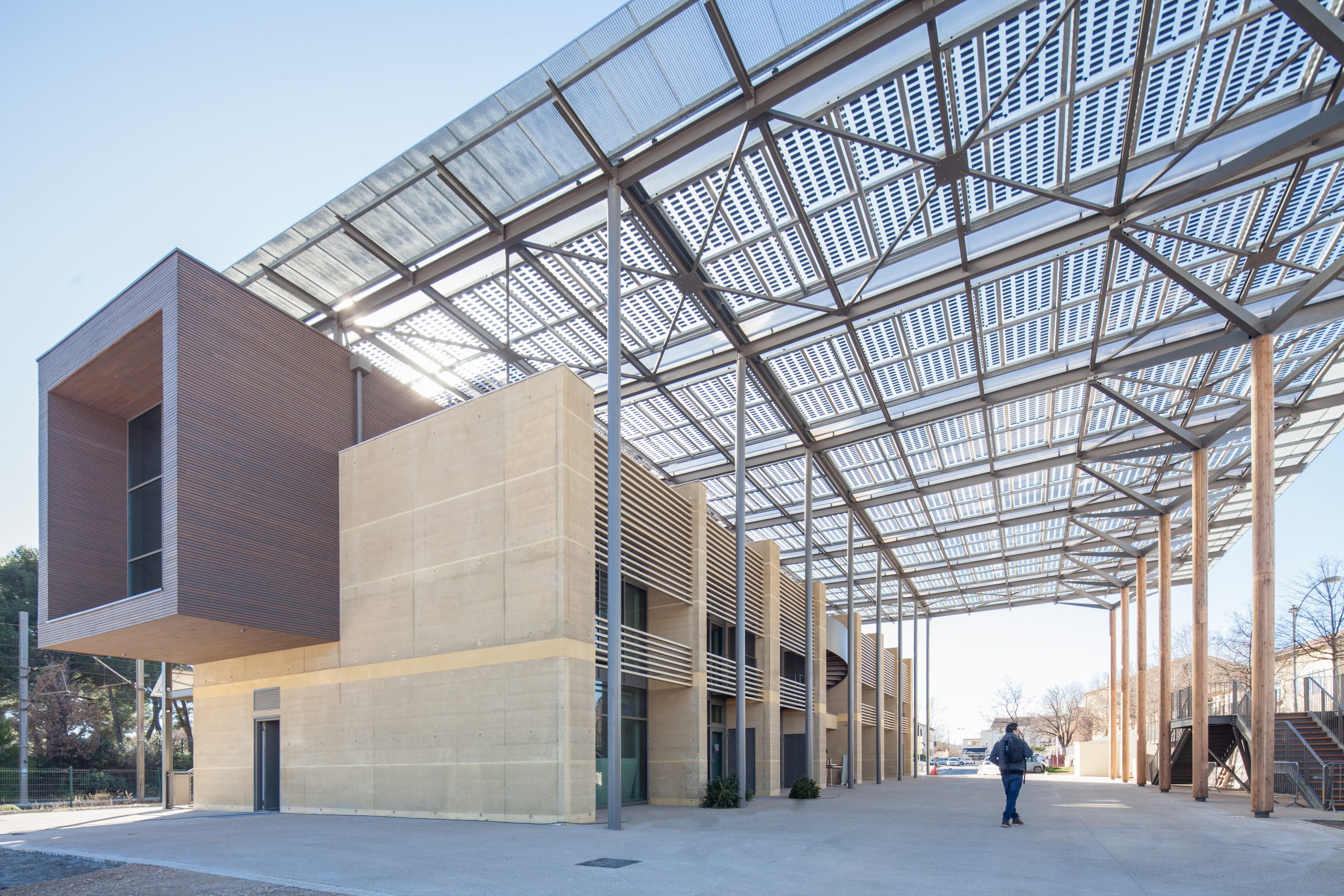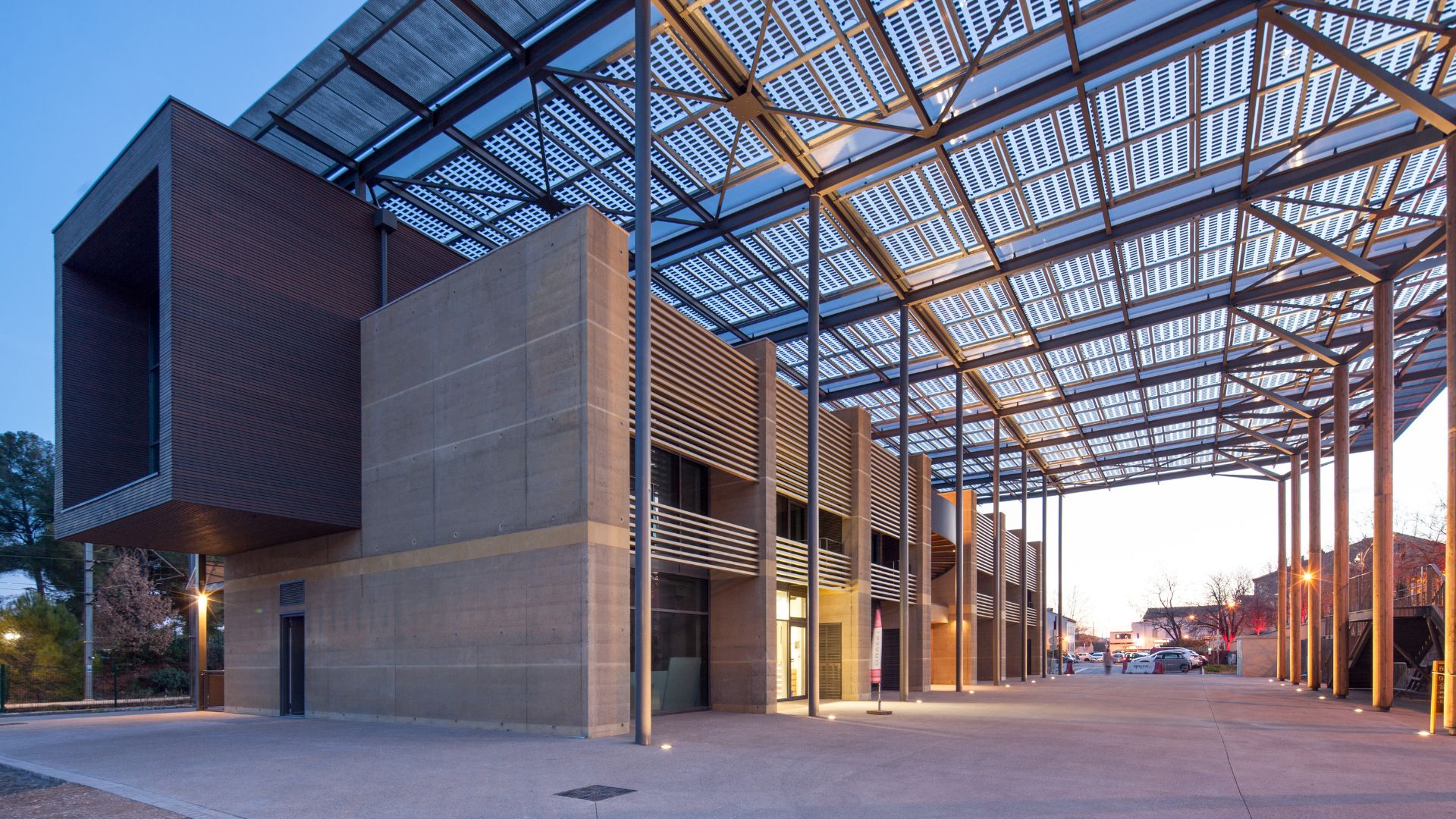 - Le bâtiment se décompose en entités architecturales identifiables répondant aux attentes du programme : commerces en rdc, bureaux en étages, terrasse lounge logée sous la couverture formant ombrière et abritant l’espace public.